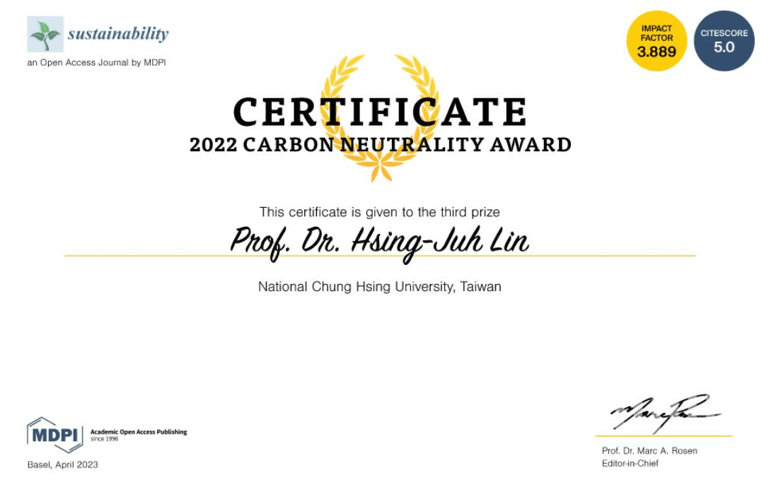 【賀】本會榮譽理事長林幸助老師榮獲國際2022永續碳中和研究獎「The Sustainability 2022 Carbon Neutrality Award」得獎人中唯一的亞洲學者