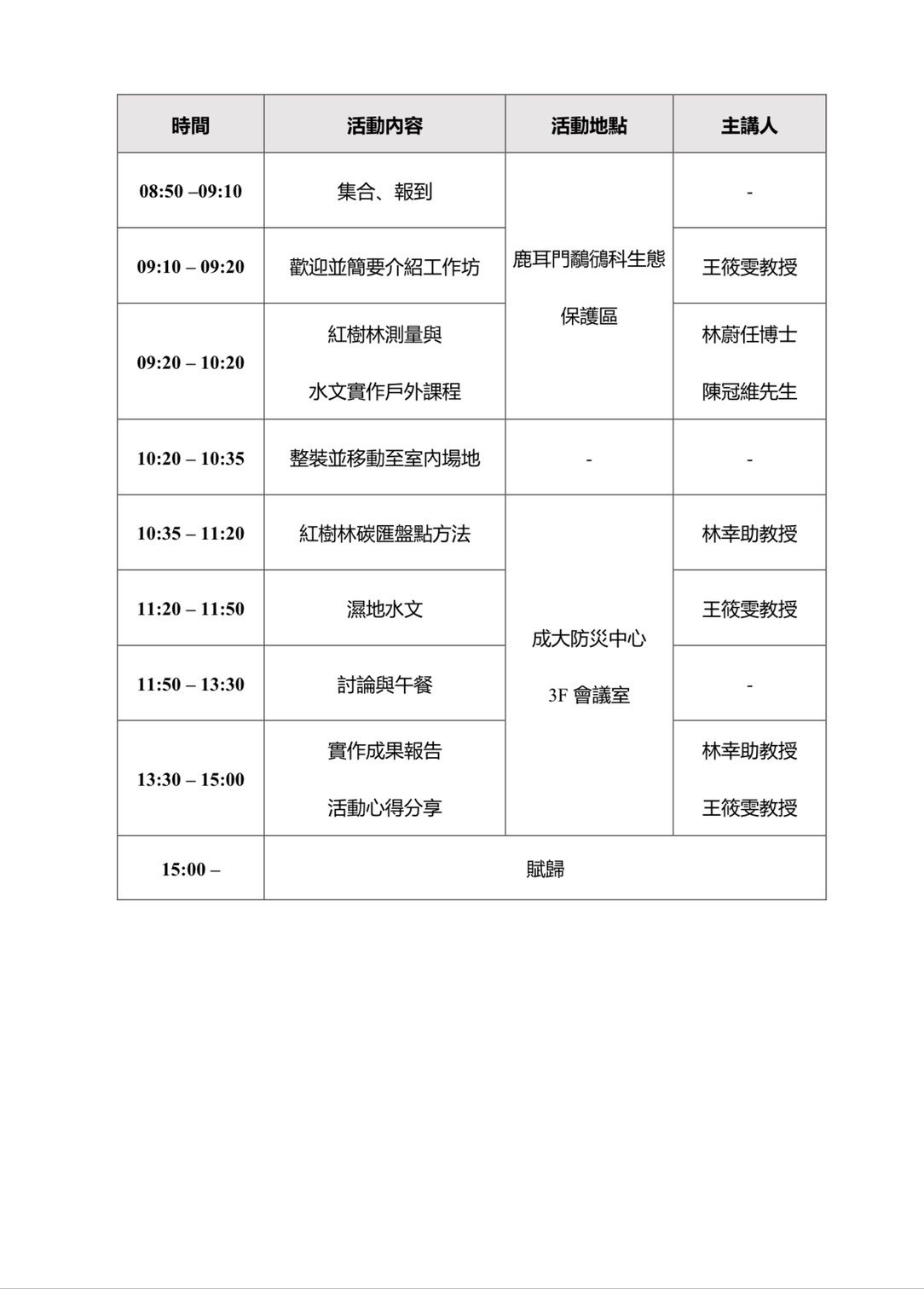紅樹林碳匯調查工作坊議程表